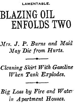 Mrs. James P. Burns (identified helpfully by The Times as the wife of James P. Burns) and maid Catherine Blake had spread a dress across a table and wrapped their hands with rags soaked in gasoline to clean it. Because the electric lights weren’t bright enough, Burns told Blake to light several candles. The candles ignited the bowl of gas, which in turn set off a nearby tank of gasoline.